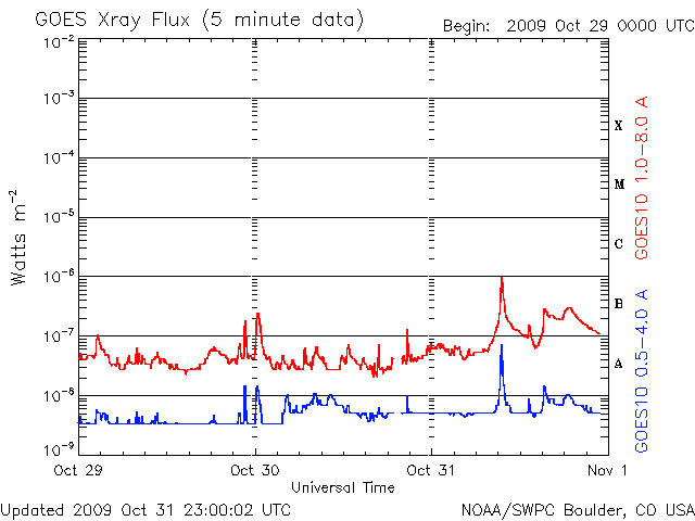 Die Daten in der obigen Grafik wurden geändert, um den Skalierungsfaktor des Space Weather Prediction Center (SWPC) zu entfernen. Durch den SWPC-Skalierungsfaktors für die Flare-Indizes werden die operativen Daten um 42 % kleiner angegeben als für die wissenschaftlichen Qualitätsdaten. Der Skalierungsfaktor wurde auch aus der Liste der Sonneneruptionen entfernt, um die tatsächlichen physikalischen Einheiten wiederzugeben.