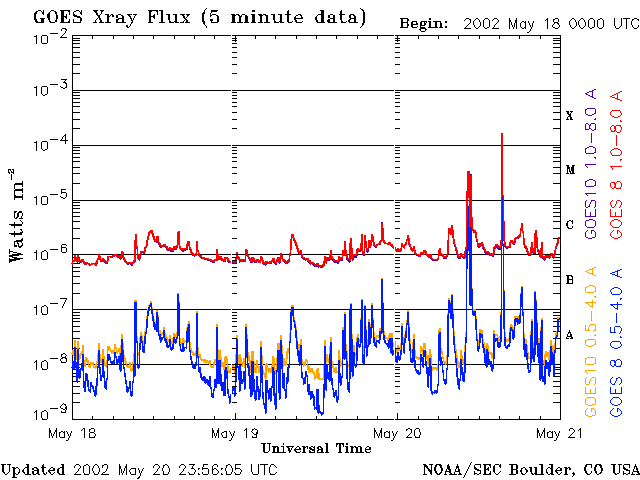 The operational data in the graph above has been modified to remove the scaling factor that has been applied by the Space Weather Prediction Center (SWPC). Because of the SWPC scaling factor in the operational data, flare indices for the operational data were reported as 42% smaller than for the science quality data. The scaling factor has also been removed from the solar flare list to reflect the true physical units.