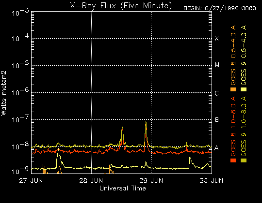 De operationele data in de bovenstaande grafiek werd aangepast om de schaalfactor te verwijderen die werd toegepast door het Space Weather Prediction Center (SWPC). Vanwege de SWPC-schaalfactor in de operationele data werden de zonnevlammen 42% kleiner gerapporteerd dan deze in de wetenschappelijke data. De schaalfactor werd ook verwijderd uit de lijst met zonnevlammen om de werkelijke fysieke eenheden weer te geven.