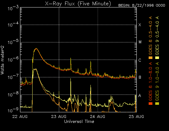 De operationele data in de bovenstaande grafiek werd aangepast om de schaalfactor te verwijderen die werd toegepast door het Space Weather Prediction Center (SWPC). Vanwege de SWPC-schaalfactor in de operationele data werden de zonnevlammen 42% kleiner gerapporteerd dan deze in de wetenschappelijke data. De schaalfactor werd ook verwijderd uit de lijst met zonnevlammen om de werkelijke fysieke eenheden weer te geven.