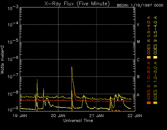 De operationele data in de bovenstaande grafiek werd aangepast om de schaalfactor te verwijderen die werd toegepast door het Space Weather Prediction Center (SWPC). Vanwege de SWPC-schaalfactor in de operationele data werden de zonnevlammen 42% kleiner gerapporteerd dan deze in de wetenschappelijke data. De schaalfactor werd ook verwijderd uit de lijst met zonnevlammen om de werkelijke fysieke eenheden weer te geven.