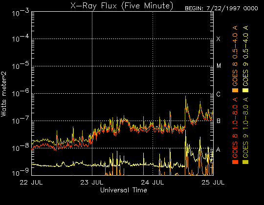 De operationele data in de bovenstaande grafiek werd aangepast om de schaalfactor te verwijderen die werd toegepast door het Space Weather Prediction Center (SWPC). Vanwege de SWPC-schaalfactor in de operationele data werden de zonnevlammen 42% kleiner gerapporteerd dan deze in de wetenschappelijke data. De schaalfactor werd ook verwijderd uit de lijst met zonnevlammen om de werkelijke fysieke eenheden weer te geven.