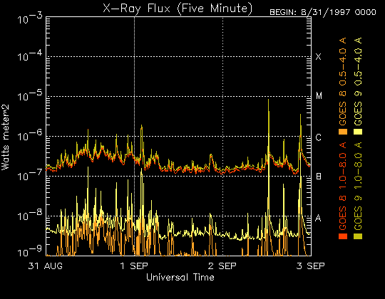 De operationele data in de bovenstaande grafiek werd aangepast om de schaalfactor te verwijderen die werd toegepast door het Space Weather Prediction Center (SWPC). Vanwege de SWPC-schaalfactor in de operationele data werden de zonnevlammen 42% kleiner gerapporteerd dan deze in de wetenschappelijke data. De schaalfactor werd ook verwijderd uit de lijst met zonnevlammen om de werkelijke fysieke eenheden weer te geven.