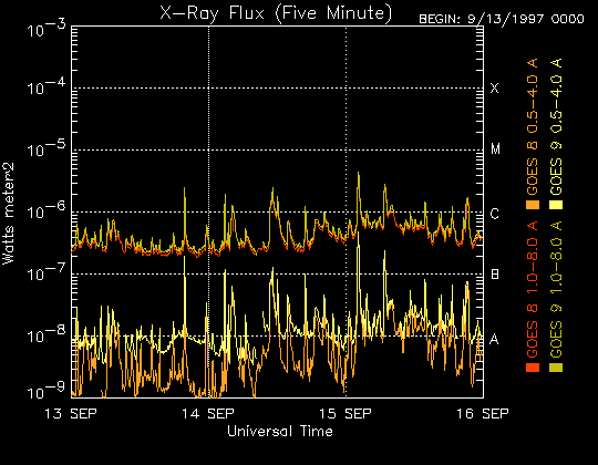 De operationele data in de bovenstaande grafiek werd aangepast om de schaalfactor te verwijderen die werd toegepast door het Space Weather Prediction Center (SWPC). Vanwege de SWPC-schaalfactor in de operationele data werden de zonnevlammen 42% kleiner gerapporteerd dan deze in de wetenschappelijke data. De schaalfactor werd ook verwijderd uit de lijst met zonnevlammen om de werkelijke fysieke eenheden weer te geven.