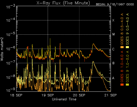 De operationele data in de bovenstaande grafiek werd aangepast om de schaalfactor te verwijderen die werd toegepast door het Space Weather Prediction Center (SWPC). Vanwege de SWPC-schaalfactor in de operationele data werden de zonnevlammen 42% kleiner gerapporteerd dan deze in de wetenschappelijke data. De schaalfactor werd ook verwijderd uit de lijst met zonnevlammen om de werkelijke fysieke eenheden weer te geven.