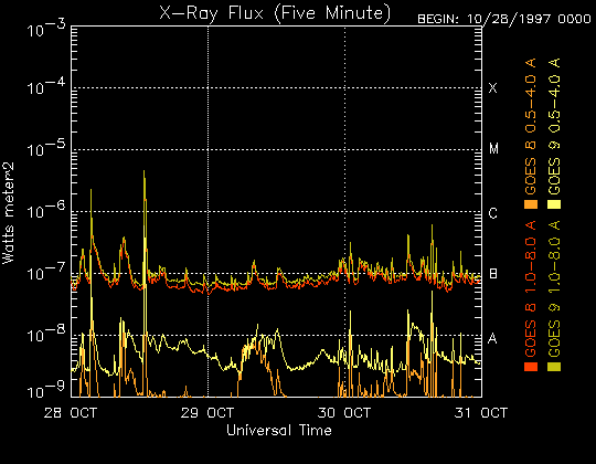De operationele data in de bovenstaande grafiek werd aangepast om de schaalfactor te verwijderen die werd toegepast door het Space Weather Prediction Center (SWPC). Vanwege de SWPC-schaalfactor in de operationele data werden de zonnevlammen 42% kleiner gerapporteerd dan deze in de wetenschappelijke data. De schaalfactor werd ook verwijderd uit de lijst met zonnevlammen om de werkelijke fysieke eenheden weer te geven.