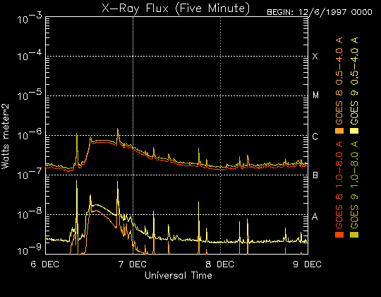 De operationele data in de bovenstaande grafiek werd aangepast om de schaalfactor te verwijderen die werd toegepast door het Space Weather Prediction Center (SWPC). Vanwege de SWPC-schaalfactor in de operationele data werden de zonnevlammen 42% kleiner gerapporteerd dan deze in de wetenschappelijke data. De schaalfactor werd ook verwijderd uit de lijst met zonnevlammen om de werkelijke fysieke eenheden weer te geven.