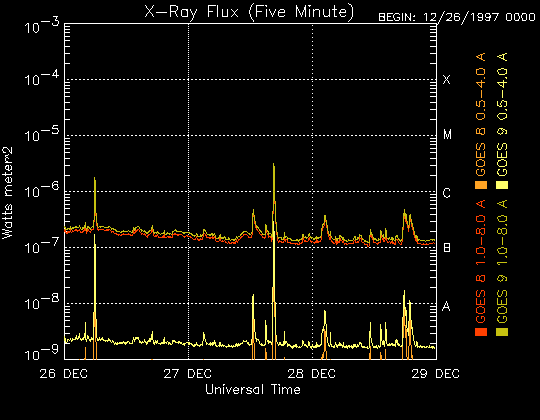 De operationele data in de bovenstaande grafiek werd aangepast om de schaalfactor te verwijderen die werd toegepast door het Space Weather Prediction Center (SWPC). Vanwege de SWPC-schaalfactor in de operationele data werden de zonnevlammen 42% kleiner gerapporteerd dan deze in de wetenschappelijke data. De schaalfactor werd ook verwijderd uit de lijst met zonnevlammen om de werkelijke fysieke eenheden weer te geven.