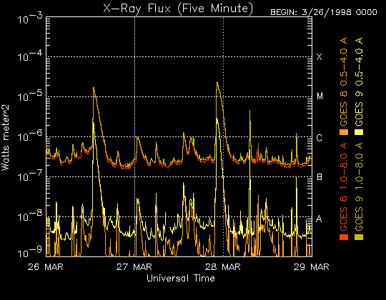 De operationele data in de bovenstaande grafiek werd aangepast om de schaalfactor te verwijderen die werd toegepast door het Space Weather Prediction Center (SWPC). Vanwege de SWPC-schaalfactor in de operationele data werden de zonnevlammen 42% kleiner gerapporteerd dan deze in de wetenschappelijke data. De schaalfactor werd ook verwijderd uit de lijst met zonnevlammen om de werkelijke fysieke eenheden weer te geven.