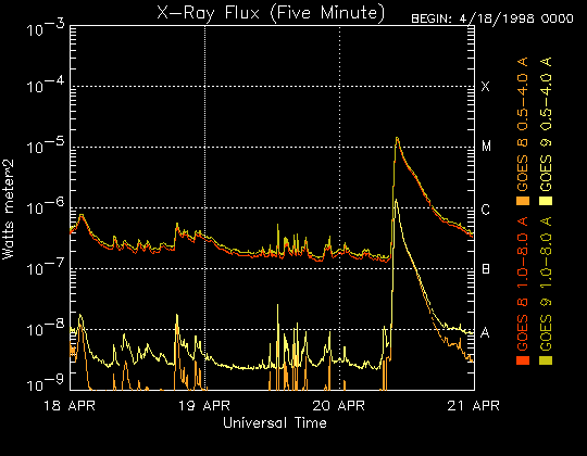 De operationele data in de bovenstaande grafiek werd aangepast om de schaalfactor te verwijderen die werd toegepast door het Space Weather Prediction Center (SWPC). Vanwege de SWPC-schaalfactor in de operationele data werden de zonnevlammen 42% kleiner gerapporteerd dan deze in de wetenschappelijke data. De schaalfactor werd ook verwijderd uit de lijst met zonnevlammen om de werkelijke fysieke eenheden weer te geven.