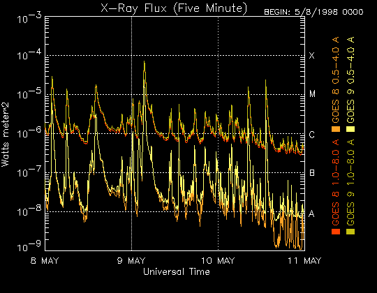 De operationele data in de bovenstaande grafiek werd aangepast om de schaalfactor te verwijderen die werd toegepast door het Space Weather Prediction Center (SWPC). Vanwege de SWPC-schaalfactor in de operationele data werden de zonnevlammen 42% kleiner gerapporteerd dan deze in de wetenschappelijke data. De schaalfactor werd ook verwijderd uit de lijst met zonnevlammen om de werkelijke fysieke eenheden weer te geven.