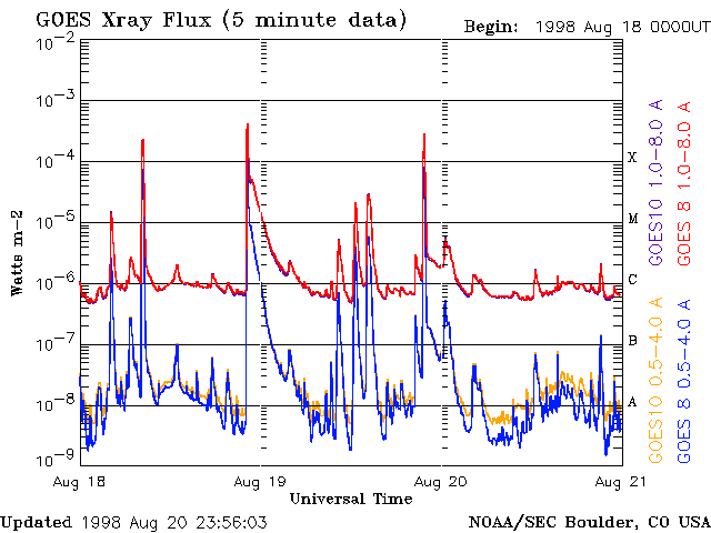 De operationele data in de bovenstaande grafiek werd aangepast om de schaalfactor te verwijderen die werd toegepast door het Space Weather Prediction Center (SWPC). Vanwege de SWPC-schaalfactor in de operationele data werden de zonnevlammen 42% kleiner gerapporteerd dan deze in de wetenschappelijke data. De schaalfactor werd ook verwijderd uit de lijst met zonnevlammen om de werkelijke fysieke eenheden weer te geven.
