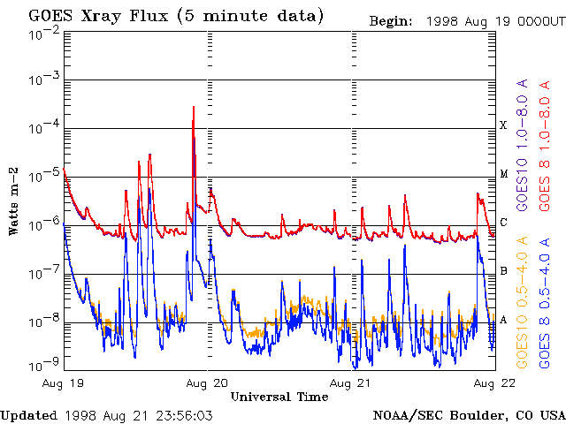 De operationele data in de bovenstaande grafiek werd aangepast om de schaalfactor te verwijderen die werd toegepast door het Space Weather Prediction Center (SWPC). Vanwege de SWPC-schaalfactor in de operationele data werden de zonnevlammen 42% kleiner gerapporteerd dan deze in de wetenschappelijke data. De schaalfactor werd ook verwijderd uit de lijst met zonnevlammen om de werkelijke fysieke eenheden weer te geven.