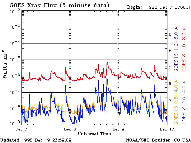 De operationele data in de bovenstaande grafiek werd aangepast om de schaalfactor te verwijderen die werd toegepast door het Space Weather Prediction Center (SWPC). Vanwege de SWPC-schaalfactor in de operationele data werden de zonnevlammen 42% kleiner gerapporteerd dan deze in de wetenschappelijke data. De schaalfactor werd ook verwijderd uit de lijst met zonnevlammen om de werkelijke fysieke eenheden weer te geven.