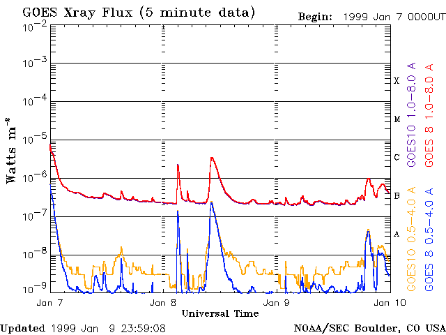De operationele data in de bovenstaande grafiek werd aangepast om de schaalfactor te verwijderen die werd toegepast door het Space Weather Prediction Center (SWPC). Vanwege de SWPC-schaalfactor in de operationele data werden de zonnevlammen 42% kleiner gerapporteerd dan deze in de wetenschappelijke data. De schaalfactor werd ook verwijderd uit de lijst met zonnevlammen om de werkelijke fysieke eenheden weer te geven.