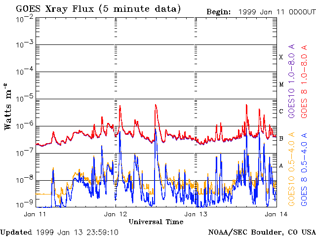 De operationele data in de bovenstaande grafiek werd aangepast om de schaalfactor te verwijderen die werd toegepast door het Space Weather Prediction Center (SWPC). Vanwege de SWPC-schaalfactor in de operationele data werden de zonnevlammen 42% kleiner gerapporteerd dan deze in de wetenschappelijke data. De schaalfactor werd ook verwijderd uit de lijst met zonnevlammen om de werkelijke fysieke eenheden weer te geven.