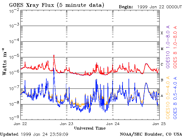 De operationele data in de bovenstaande grafiek werd aangepast om de schaalfactor te verwijderen die werd toegepast door het Space Weather Prediction Center (SWPC). Vanwege de SWPC-schaalfactor in de operationele data werden de zonnevlammen 42% kleiner gerapporteerd dan deze in de wetenschappelijke data. De schaalfactor werd ook verwijderd uit de lijst met zonnevlammen om de werkelijke fysieke eenheden weer te geven.