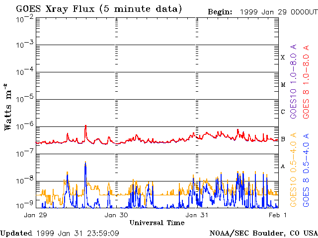 De operationele data in de bovenstaande grafiek werd aangepast om de schaalfactor te verwijderen die werd toegepast door het Space Weather Prediction Center (SWPC). Vanwege de SWPC-schaalfactor in de operationele data werden de zonnevlammen 42% kleiner gerapporteerd dan deze in de wetenschappelijke data. De schaalfactor werd ook verwijderd uit de lijst met zonnevlammen om de werkelijke fysieke eenheden weer te geven.