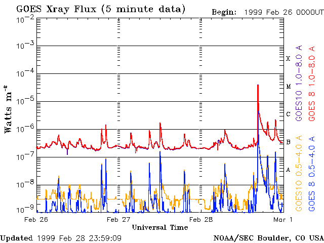 De operationele data in de bovenstaande grafiek werd aangepast om de schaalfactor te verwijderen die werd toegepast door het Space Weather Prediction Center (SWPC). Vanwege de SWPC-schaalfactor in de operationele data werden de zonnevlammen 42% kleiner gerapporteerd dan deze in de wetenschappelijke data. De schaalfactor werd ook verwijderd uit de lijst met zonnevlammen om de werkelijke fysieke eenheden weer te geven.