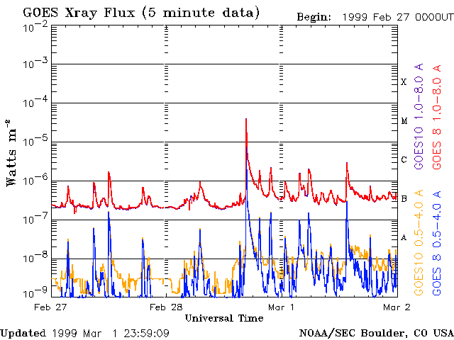 De operationele data in de bovenstaande grafiek werd aangepast om de schaalfactor te verwijderen die werd toegepast door het Space Weather Prediction Center (SWPC). Vanwege de SWPC-schaalfactor in de operationele data werden de zonnevlammen 42% kleiner gerapporteerd dan deze in de wetenschappelijke data. De schaalfactor werd ook verwijderd uit de lijst met zonnevlammen om de werkelijke fysieke eenheden weer te geven.