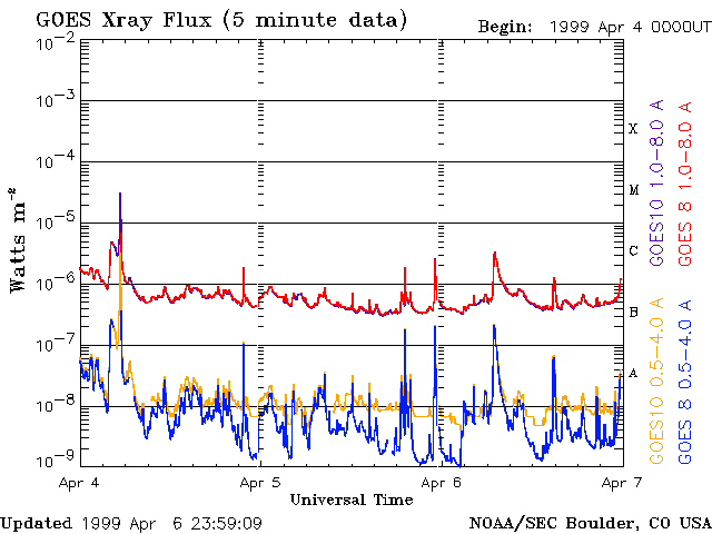 De operationele data in de bovenstaande grafiek werd aangepast om de schaalfactor te verwijderen die werd toegepast door het Space Weather Prediction Center (SWPC). Vanwege de SWPC-schaalfactor in de operationele data werden de zonnevlammen 42% kleiner gerapporteerd dan deze in de wetenschappelijke data. De schaalfactor werd ook verwijderd uit de lijst met zonnevlammen om de werkelijke fysieke eenheden weer te geven.
