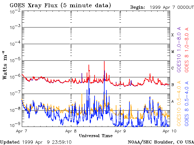 De operationele data in de bovenstaande grafiek werd aangepast om de schaalfactor te verwijderen die werd toegepast door het Space Weather Prediction Center (SWPC). Vanwege de SWPC-schaalfactor in de operationele data werden de zonnevlammen 42% kleiner gerapporteerd dan deze in de wetenschappelijke data. De schaalfactor werd ook verwijderd uit de lijst met zonnevlammen om de werkelijke fysieke eenheden weer te geven.