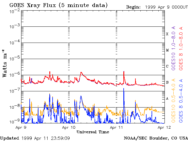 De operationele data in de bovenstaande grafiek werd aangepast om de schaalfactor te verwijderen die werd toegepast door het Space Weather Prediction Center (SWPC). Vanwege de SWPC-schaalfactor in de operationele data werden de zonnevlammen 42% kleiner gerapporteerd dan deze in de wetenschappelijke data. De schaalfactor werd ook verwijderd uit de lijst met zonnevlammen om de werkelijke fysieke eenheden weer te geven.