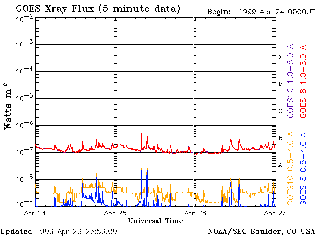 De operationele data in de bovenstaande grafiek werd aangepast om de schaalfactor te verwijderen die werd toegepast door het Space Weather Prediction Center (SWPC). Vanwege de SWPC-schaalfactor in de operationele data werden de zonnevlammen 42% kleiner gerapporteerd dan deze in de wetenschappelijke data. De schaalfactor werd ook verwijderd uit de lijst met zonnevlammen om de werkelijke fysieke eenheden weer te geven.