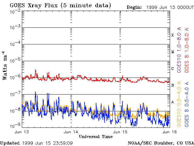 De operationele data in de bovenstaande grafiek werd aangepast om de schaalfactor te verwijderen die werd toegepast door het Space Weather Prediction Center (SWPC). Vanwege de SWPC-schaalfactor in de operationele data werden de zonnevlammen 42% kleiner gerapporteerd dan deze in de wetenschappelijke data. De schaalfactor werd ook verwijderd uit de lijst met zonnevlammen om de werkelijke fysieke eenheden weer te geven.