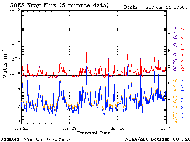 De operationele data in de bovenstaande grafiek werd aangepast om de schaalfactor te verwijderen die werd toegepast door het Space Weather Prediction Center (SWPC). Vanwege de SWPC-schaalfactor in de operationele data werden de zonnevlammen 42% kleiner gerapporteerd dan deze in de wetenschappelijke data. De schaalfactor werd ook verwijderd uit de lijst met zonnevlammen om de werkelijke fysieke eenheden weer te geven.