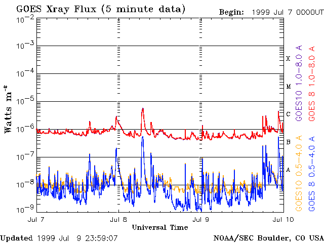 De operationele data in de bovenstaande grafiek werd aangepast om de schaalfactor te verwijderen die werd toegepast door het Space Weather Prediction Center (SWPC). Vanwege de SWPC-schaalfactor in de operationele data werden de zonnevlammen 42% kleiner gerapporteerd dan deze in de wetenschappelijke data. De schaalfactor werd ook verwijderd uit de lijst met zonnevlammen om de werkelijke fysieke eenheden weer te geven.