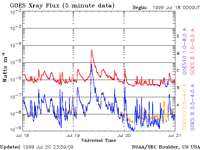 De operationele data in de bovenstaande grafiek werd aangepast om de schaalfactor te verwijderen die werd toegepast door het Space Weather Prediction Center (SWPC). Vanwege de SWPC-schaalfactor in de operationele data werden de zonnevlammen 42% kleiner gerapporteerd dan deze in de wetenschappelijke data. De schaalfactor werd ook verwijderd uit de lijst met zonnevlammen om de werkelijke fysieke eenheden weer te geven.