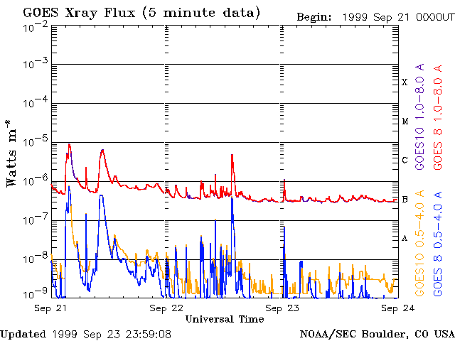 De operationele data in de bovenstaande grafiek werd aangepast om de schaalfactor te verwijderen die werd toegepast door het Space Weather Prediction Center (SWPC). Vanwege de SWPC-schaalfactor in de operationele data werden de zonnevlammen 42% kleiner gerapporteerd dan deze in de wetenschappelijke data. De schaalfactor werd ook verwijderd uit de lijst met zonnevlammen om de werkelijke fysieke eenheden weer te geven.