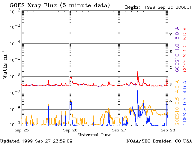 De operationele data in de bovenstaande grafiek werd aangepast om de schaalfactor te verwijderen die werd toegepast door het Space Weather Prediction Center (SWPC). Vanwege de SWPC-schaalfactor in de operationele data werden de zonnevlammen 42% kleiner gerapporteerd dan deze in de wetenschappelijke data. De schaalfactor werd ook verwijderd uit de lijst met zonnevlammen om de werkelijke fysieke eenheden weer te geven.