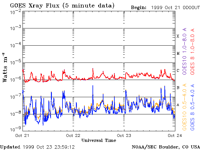 De operationele data in de bovenstaande grafiek werd aangepast om de schaalfactor te verwijderen die werd toegepast door het Space Weather Prediction Center (SWPC). Vanwege de SWPC-schaalfactor in de operationele data werden de zonnevlammen 42% kleiner gerapporteerd dan deze in de wetenschappelijke data. De schaalfactor werd ook verwijderd uit de lijst met zonnevlammen om de werkelijke fysieke eenheden weer te geven.