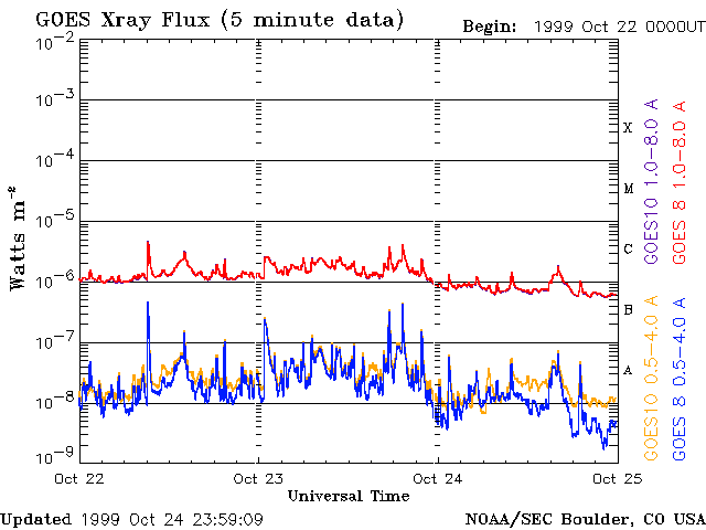 De operationele data in de bovenstaande grafiek werd aangepast om de schaalfactor te verwijderen die werd toegepast door het Space Weather Prediction Center (SWPC). Vanwege de SWPC-schaalfactor in de operationele data werden de zonnevlammen 42% kleiner gerapporteerd dan deze in de wetenschappelijke data. De schaalfactor werd ook verwijderd uit de lijst met zonnevlammen om de werkelijke fysieke eenheden weer te geven.
