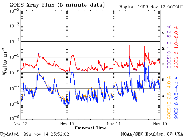 De operationele data in de bovenstaande grafiek werd aangepast om de schaalfactor te verwijderen die werd toegepast door het Space Weather Prediction Center (SWPC). Vanwege de SWPC-schaalfactor in de operationele data werden de zonnevlammen 42% kleiner gerapporteerd dan deze in de wetenschappelijke data. De schaalfactor werd ook verwijderd uit de lijst met zonnevlammen om de werkelijke fysieke eenheden weer te geven.