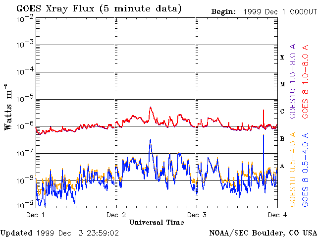 De operationele data in de bovenstaande grafiek werd aangepast om de schaalfactor te verwijderen die werd toegepast door het Space Weather Prediction Center (SWPC). Vanwege de SWPC-schaalfactor in de operationele data werden de zonnevlammen 42% kleiner gerapporteerd dan deze in de wetenschappelijke data. De schaalfactor werd ook verwijderd uit de lijst met zonnevlammen om de werkelijke fysieke eenheden weer te geven.