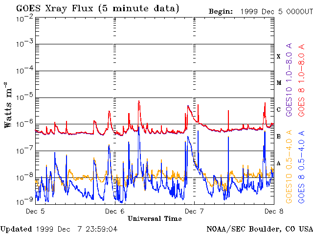 De operationele data in de bovenstaande grafiek werd aangepast om de schaalfactor te verwijderen die werd toegepast door het Space Weather Prediction Center (SWPC). Vanwege de SWPC-schaalfactor in de operationele data werden de zonnevlammen 42% kleiner gerapporteerd dan deze in de wetenschappelijke data. De schaalfactor werd ook verwijderd uit de lijst met zonnevlammen om de werkelijke fysieke eenheden weer te geven.