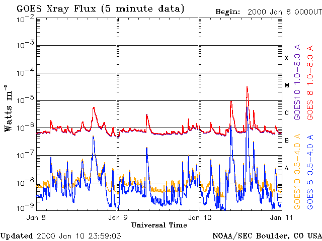 De operationele data in de bovenstaande grafiek werd aangepast om de schaalfactor te verwijderen die werd toegepast door het Space Weather Prediction Center (SWPC). Vanwege de SWPC-schaalfactor in de operationele data werden de zonnevlammen 42% kleiner gerapporteerd dan deze in de wetenschappelijke data. De schaalfactor werd ook verwijderd uit de lijst met zonnevlammen om de werkelijke fysieke eenheden weer te geven.