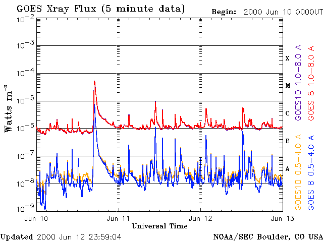 De operationele data in de bovenstaande grafiek werd aangepast om de schaalfactor te verwijderen die werd toegepast door het Space Weather Prediction Center (SWPC). Vanwege de SWPC-schaalfactor in de operationele data werden de zonnevlammen 42% kleiner gerapporteerd dan deze in de wetenschappelijke data. De schaalfactor werd ook verwijderd uit de lijst met zonnevlammen om de werkelijke fysieke eenheden weer te geven.