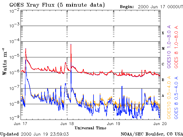 De operationele data in de bovenstaande grafiek werd aangepast om de schaalfactor te verwijderen die werd toegepast door het Space Weather Prediction Center (SWPC). Vanwege de SWPC-schaalfactor in de operationele data werden de zonnevlammen 42% kleiner gerapporteerd dan deze in de wetenschappelijke data. De schaalfactor werd ook verwijderd uit de lijst met zonnevlammen om de werkelijke fysieke eenheden weer te geven.