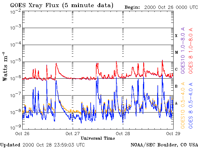 De operationele data in de bovenstaande grafiek werd aangepast om de schaalfactor te verwijderen die werd toegepast door het Space Weather Prediction Center (SWPC). Vanwege de SWPC-schaalfactor in de operationele data werden de zonnevlammen 42% kleiner gerapporteerd dan deze in de wetenschappelijke data. De schaalfactor werd ook verwijderd uit de lijst met zonnevlammen om de werkelijke fysieke eenheden weer te geven.