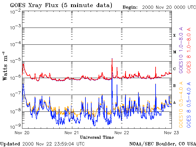 De operationele data in de bovenstaande grafiek werd aangepast om de schaalfactor te verwijderen die werd toegepast door het Space Weather Prediction Center (SWPC). Vanwege de SWPC-schaalfactor in de operationele data werden de zonnevlammen 42% kleiner gerapporteerd dan deze in de wetenschappelijke data. De schaalfactor werd ook verwijderd uit de lijst met zonnevlammen om de werkelijke fysieke eenheden weer te geven.
