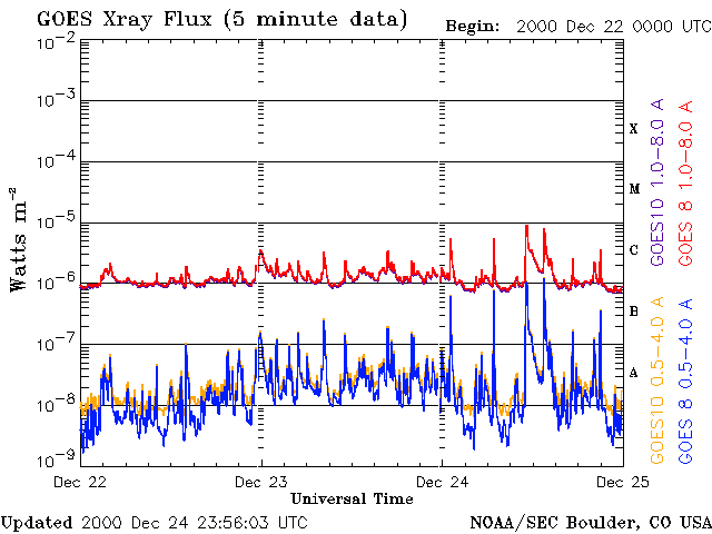 De operationele data in de bovenstaande grafiek werd aangepast om de schaalfactor te verwijderen die werd toegepast door het Space Weather Prediction Center (SWPC). Vanwege de SWPC-schaalfactor in de operationele data werden de zonnevlammen 42% kleiner gerapporteerd dan deze in de wetenschappelijke data. De schaalfactor werd ook verwijderd uit de lijst met zonnevlammen om de werkelijke fysieke eenheden weer te geven.