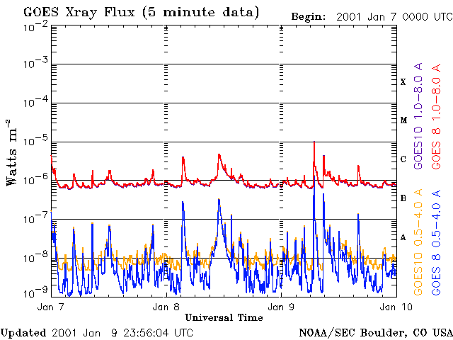 De operationele data in de bovenstaande grafiek werd aangepast om de schaalfactor te verwijderen die werd toegepast door het Space Weather Prediction Center (SWPC). Vanwege de SWPC-schaalfactor in de operationele data werden de zonnevlammen 42% kleiner gerapporteerd dan deze in de wetenschappelijke data. De schaalfactor werd ook verwijderd uit de lijst met zonnevlammen om de werkelijke fysieke eenheden weer te geven.