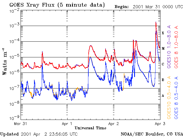 De operationele data in de bovenstaande grafiek werd aangepast om de schaalfactor te verwijderen die werd toegepast door het Space Weather Prediction Center (SWPC). Vanwege de SWPC-schaalfactor in de operationele data werden de zonnevlammen 42% kleiner gerapporteerd dan deze in de wetenschappelijke data. De schaalfactor werd ook verwijderd uit de lijst met zonnevlammen om de werkelijke fysieke eenheden weer te geven.