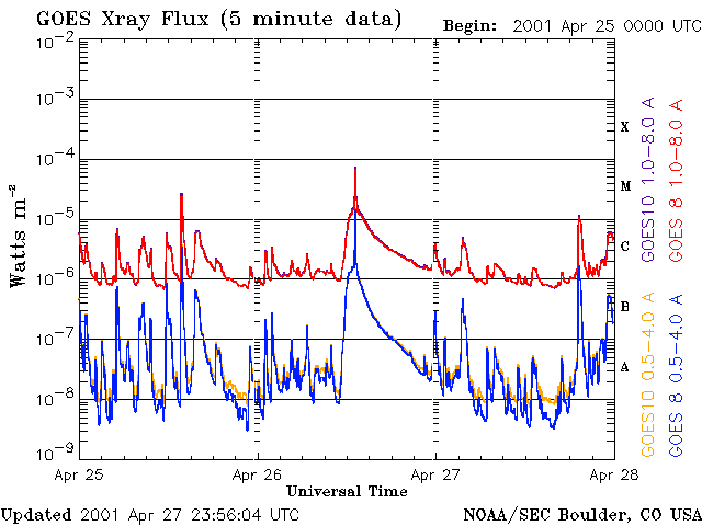 De operationele data in de bovenstaande grafiek werd aangepast om de schaalfactor te verwijderen die werd toegepast door het Space Weather Prediction Center (SWPC). Vanwege de SWPC-schaalfactor in de operationele data werden de zonnevlammen 42% kleiner gerapporteerd dan deze in de wetenschappelijke data. De schaalfactor werd ook verwijderd uit de lijst met zonnevlammen om de werkelijke fysieke eenheden weer te geven.