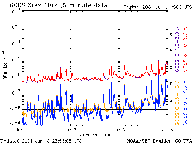 De operationele data in de bovenstaande grafiek werd aangepast om de schaalfactor te verwijderen die werd toegepast door het Space Weather Prediction Center (SWPC). Vanwege de SWPC-schaalfactor in de operationele data werden de zonnevlammen 42% kleiner gerapporteerd dan deze in de wetenschappelijke data. De schaalfactor werd ook verwijderd uit de lijst met zonnevlammen om de werkelijke fysieke eenheden weer te geven.