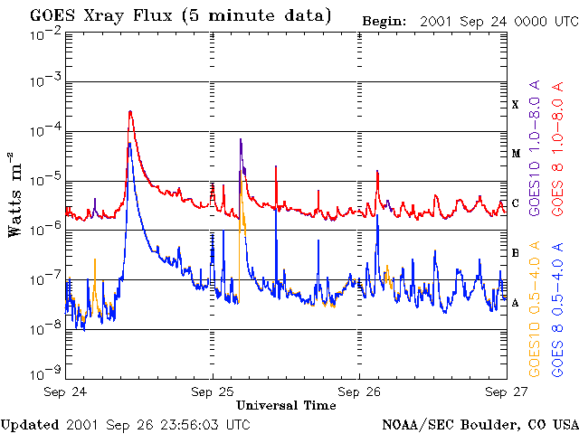 De operationele data in de bovenstaande grafiek werd aangepast om de schaalfactor te verwijderen die werd toegepast door het Space Weather Prediction Center (SWPC). Vanwege de SWPC-schaalfactor in de operationele data werden de zonnevlammen 42% kleiner gerapporteerd dan deze in de wetenschappelijke data. De schaalfactor werd ook verwijderd uit de lijst met zonnevlammen om de werkelijke fysieke eenheden weer te geven.